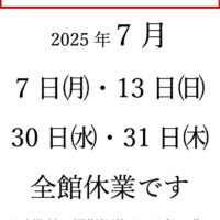 臨時休業のお知らせ 下記の日程で臨時休業させていただきます。 7月7日(月) 7月13日(日) 7月30日(水) 7月31日(木) 全館休業となります。 ※7月5日(土)・7月6日(日) ご予約以外ほうろく亭はお休み お …