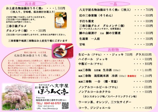 小さな三春町にたくさんのお客様が来て下さるこの時期、私共、八文字屋は昔ながらの手作りの味にこだわり、来て下さったお客様に滋味深い郷土の味をお召し上がりいただきたく、ご注文を頂いてから調理いたしますので、お時間がかかる場合がございます。